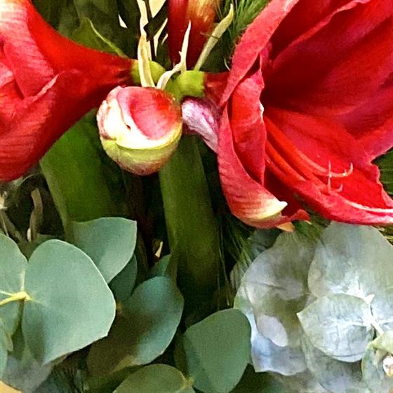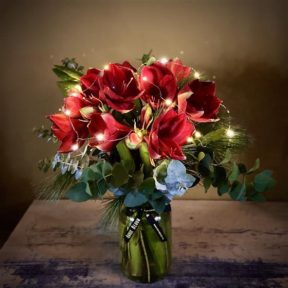 Celebrate the holiday season with our stunning amaryllis design, a Christmas favourite that will bring joy to every home. Delicately presented in an eco-friendly glass container and paired with locally grown Irish foliage, this arrangement is ready for instant display. To make it even more festive, add an LED string light from the list below to enhance the beauty of the blooms. Please note that flowers may be delivered in bud form for longevity. The colors of flowers and style of the glass container may vary from those shown based on daily availability, but rest assured, we will craft a beautiful gift. The average stem length is approximately 40-45cm. The standard option includes 6-8 heads of blooms on three stems of clustered amaryllis with a generous amount of foliage. Bring the spirit of the season into your home with this fabulous Christmas favourite. (LED is an add-on, not included in the price)