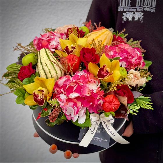 Discover our exquisite Autumnal selection of seasonal flowers, carefully curated with a blend of dried and fresh materials, and enriched with Irish grown foliage. Each element comes together to create a stunning hatbox arrangement that captures the essence of the season. Get ready to embrace the beauty of Autumn with this unique creation.