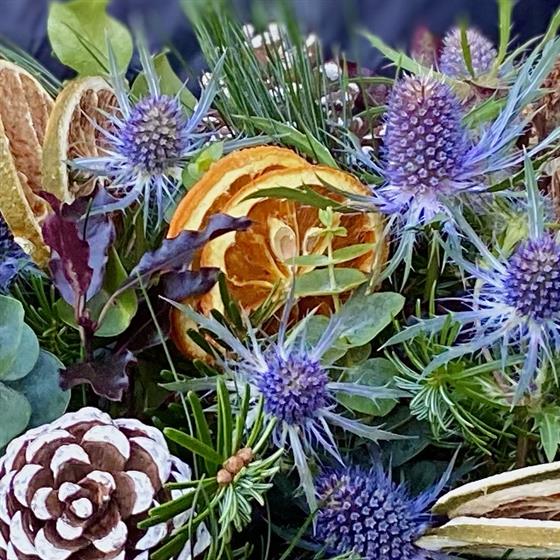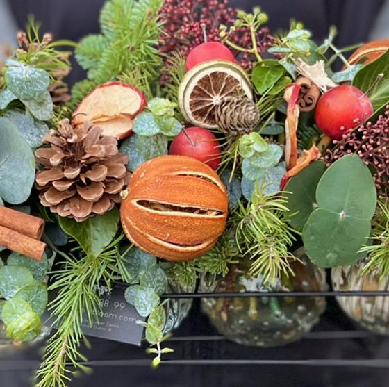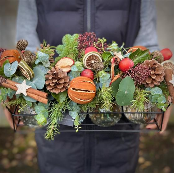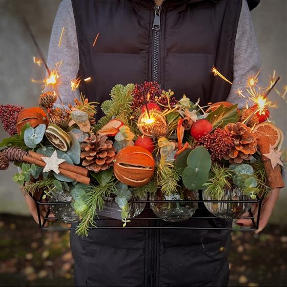 A winter spicy twist on our ever popular Blooming Marvellous bottle set including fragrant seasonal foliage, pine cones, dried oranges and more to bring the scent of Winter into the home. We may use a selection of dried and fresh materials, designs and bottle sets may vary from those shown on picture. This is a compact design, average stem length is approximately 8-12cm. You may add LED lights to make it more festive from the list below. Sparklers not included. Tray lengths, shapes and sizes vary between approximately 20-40cm.