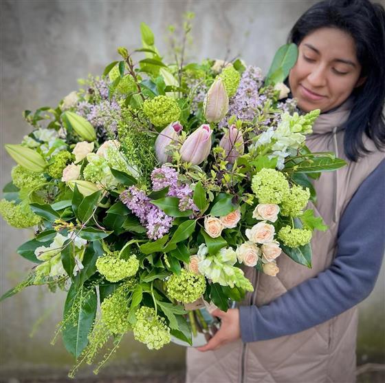 Discover the exquisitely luxurious collection of delicate pastel-colored seasonal flowers, elegantly intertwined with locally sourced Irish-grown foliage. This meticulously crafted garden-style bouquet is artfully arranged in a sustainable, eco-friendly glass container, ready to adorn any space instantly. Please note that while the floral content and hues may vary, our skilled designer will always incorporate pastel colours. Embrace the beauty of nature with this captivating arrangement. Please note that the image shown represents the luxury option. Standard option includes approximately ten to twelve stems of florals. Keep in mind that this is a compact design, with an average stem length of approximately 40-45cm.