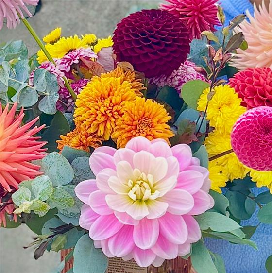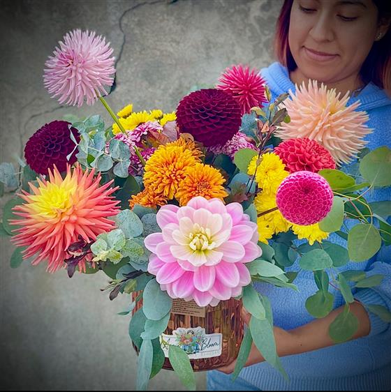 100% Irish product! Stunning selection of locally grown Irish dahlias accented with seasonal blooms and locally grown Irish foliage, presented in an eco friendly glass container for instant display. This is a stunning selection of the most beautiful flowers, arranged in the trendiest free style bouquet. Please note individual stems and colours can greatly vary from those shown on picture according to daily availability. Image displayed is of large option, standard option includes approximately six-seven stems of flowers. Please note dahlias are fragile short lasting flowers therefore we can only guarantee them to last a for two to four days.