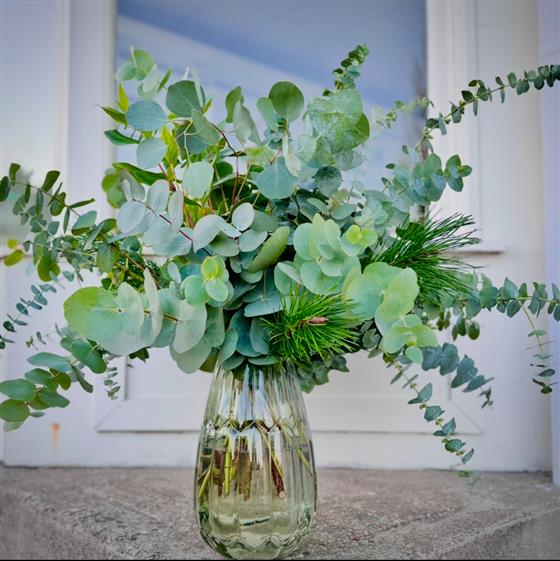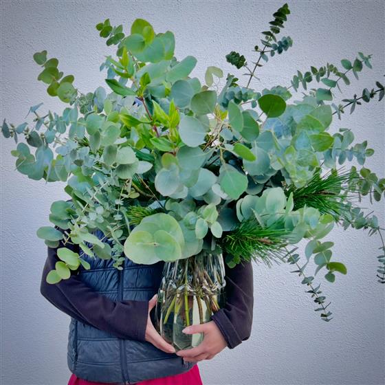 Perfume your home with the scents of the season. This eco friendly glass vase is filled with fresh Irish grown Eucalyptus and a fabulously rich mix of other locally grown long lasting foliage varieties. Standard option stem length is approximately 35cm and includes approximately 8-10 sprays of foliages. Image displayed is of deluxe option.