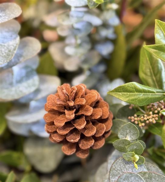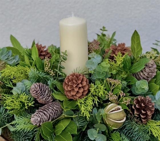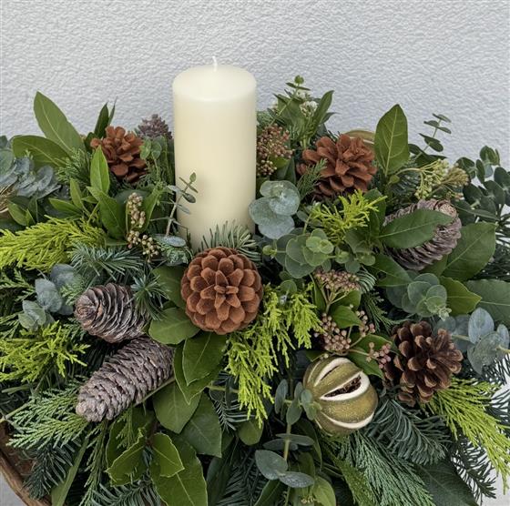 Discover the Evergreen Embrace Collection - the ultimate choice for decking out your entire home this festive season. This beautiful candle arrangement for the dinner table will leave everyone in awe. Carefully curated with an abundance of deliciously fragrant silver eucalyptus, bay leaf, cyperus, beautiful flowery viburnum, and a variety of other super fresh Irish-grown foliage, all freshly cut from our favourite farm in Wicklow and adorned with cinnamon-covered pine cones. This arrangement will last for weeks and gracefully dry out, creating a permanent decorative piece.