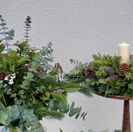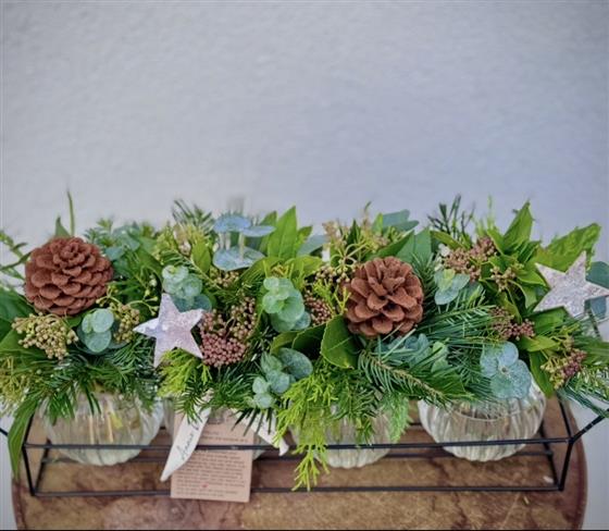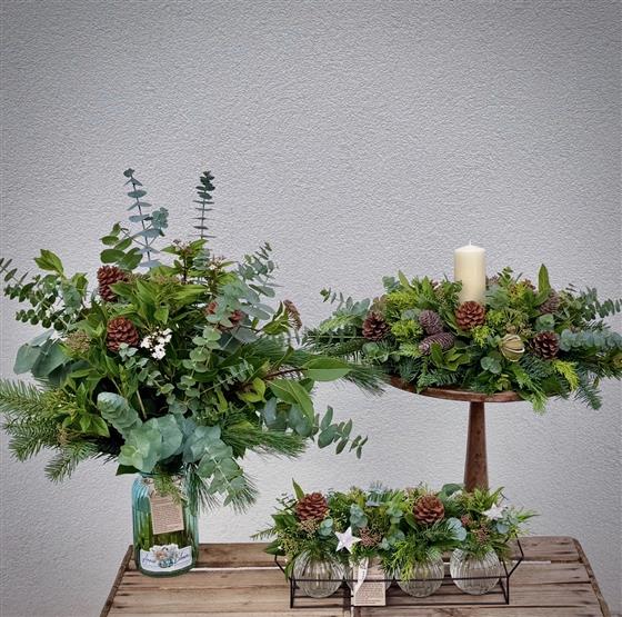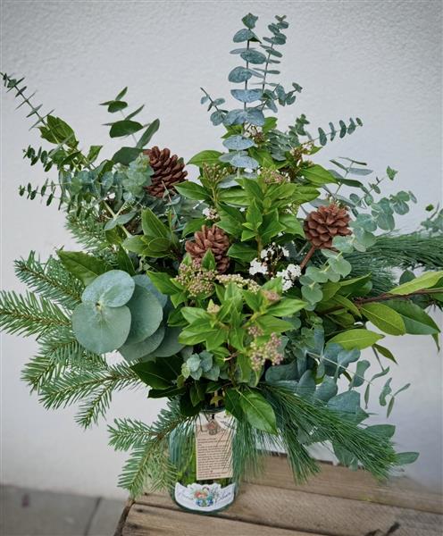 Discover the Evergreen Embrace Collection - the ultimate choice for decking out your entire home this festive season. This trio features a set of 4 bottles on a tray, a candle arrangement for the dinner table, and a stunning hand-tied bouquet. Carefully curated with an abundance of deliciously fragrant eucalyptus, bay leaf, cyperus, beautiful flowery viburnum, and a variety of other super fresh Irish-grown foliage, all freshly cut from our favourite farm in Wicklow and adorned with cinnamon-covered pine cones. This collection will last for weeks and gracefully dry out, creating a permanent decorative piece. Why not deck out the entire house with the whole collection, setting the most amazing festive vibe? Shop the Evergreen Embrace Collection now and elevate your festive decor or surprise someone with this stunning gift bundle. The image displayed is of medium option. Standard option includes a bouquet with a medium stem length, a standard-size table candle arrangement, and a set of 4 bottles on a tray. Larger options will include a larger buque and a larger table arrangement.
