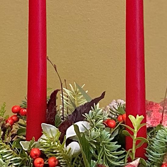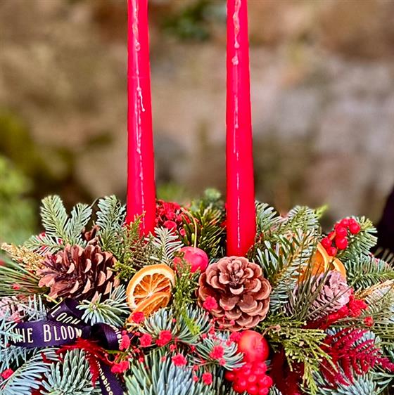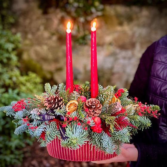 Welcome to our classic candle arrangement, perfect for your Christmas dinner. This exquisite arrangement is skillfully crafted in a ceramic container and features luxurious Irish-grown foliage, cones, berries, and other long-lasting elements. Please note that container styles and colours may vary from the images shown. The standard option measures approximately 30cm in length, while the larger options will remain the same size; they will be adorned with additional orchids and other exquisite fresh flowers of the day. To add an extra touch of elegance, this arrangement may also include a variety of dried and ancillary materials for decorative purposes. Make your Christmas dinner truly special with this timeless centrepiece.