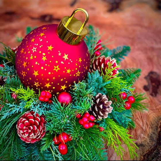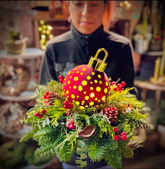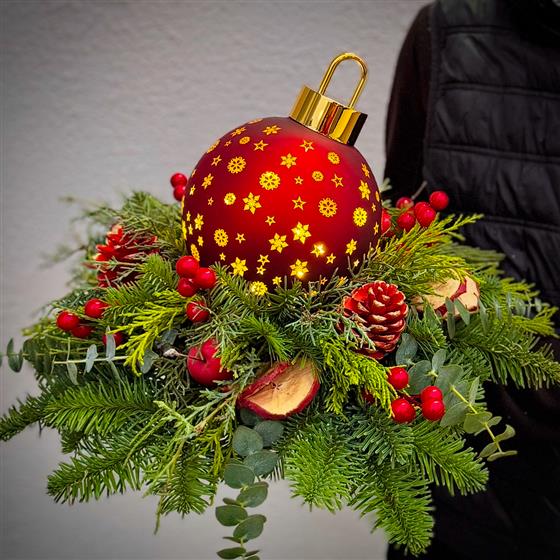 Welcome to our beautiful and festive arrangement featuring an LED light glass bauble. This stunning piece is accompanied by wonderfully fragrant fresh Irish winter foliage, cones, berries, and dried fruit. Please note that the LED bauble's colour may differ from the picture above, adding a delightful element of surprise. Whether you choose the small or large option, this is the perfect festive item for those who prefer not to use candles but still want to bring festive light to the dinner table this season. Ideal for any space if you are looking for a unique and elegant addition to the holiday decor.