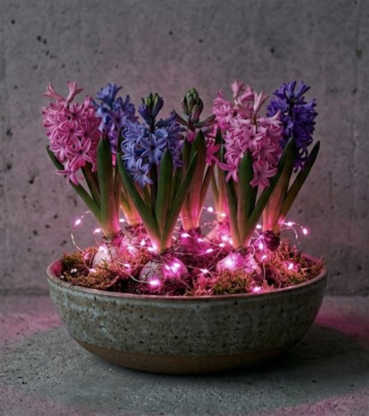 A beautiful planter of fragrant hyacinths that you can watch while they grow, adorned with LED string light that you can switch on and off at your convenience. LED light are always included with this planter.