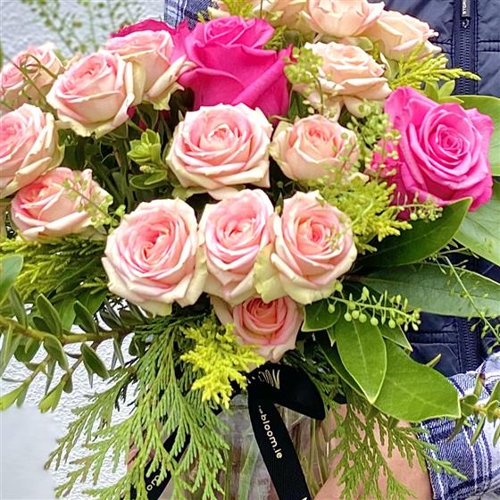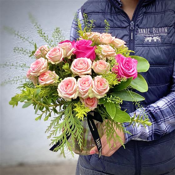 A dainty selection of pretty roses and seasonal Irish grown foliage compactly arranged free style in a glass jar. Colours and rose varieties may differ. Image displayed is of The Jam option. Please note this is a compact design, average stem length is approximately 20cm. Standard option includes approximately 4-5 stems/sprays of blooms.