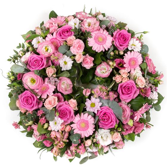 Pink seasonal flowers are the main focus of this feminine wreath. Image displayed is of deluxe option. Standard size is approximately 7 inches in diameter. Colours and flower varieties may differ from those shown according to seasonal availability.