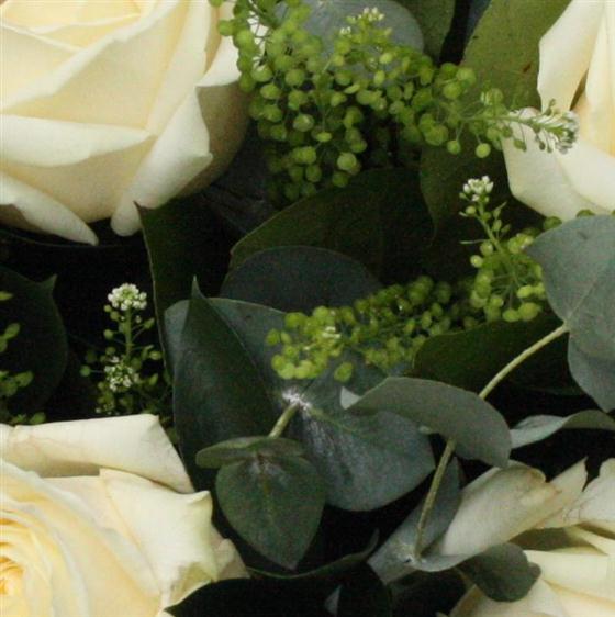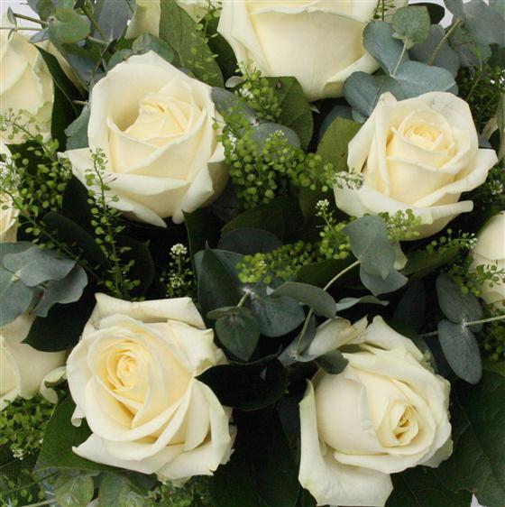 An elegant and stylish bouquet of white roses mixed with a variety of contemporary foliage, compactly arranged in our eco friendly glass container. Standard option includes 12 roses. Average stem length is approximately 50-55cm